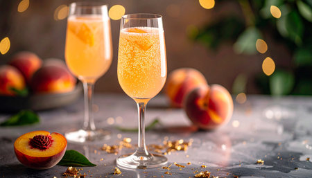 Sparkling peach bellini in champagne flute with peach puree, gold foil, marble, bokeh lights.