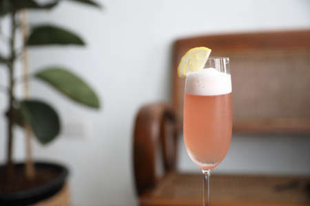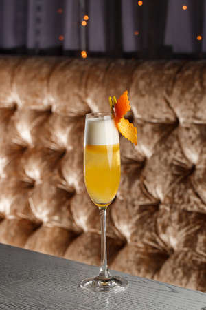 Glass of a delicious yellow cocktail French 75 standing on the bar counter on the blurred dark and yellow light background.