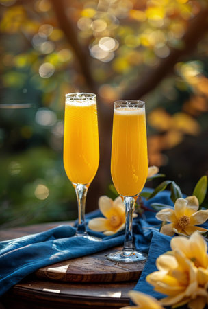 Refreshing mimosa cocktail amidst lush greenery and yellow blossoms