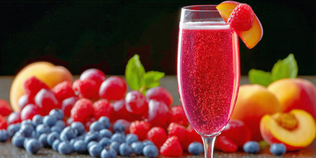 A vibrant drink filled with berries is placed beside an array of fresh fruits such as peaches, grapes, and raspberries on a wooden surface.