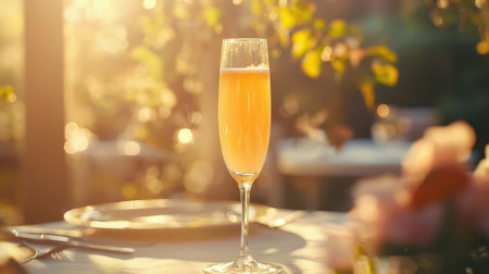 A glass of champagne is sitting on a table with a plate and silverware. The atmosphere is elegant and sophisticated