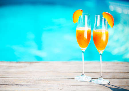 Champagne glasses with peach. Bellini cocktail. Summer pool party