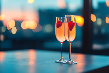 Two elegant champagne glasses filled with bubbly golden liquid and garnished with fresh strawberry slices are placed on a table. The background features a beautiful bokeh effect of city lights at dusk or sunset, creating a romantic and celebratory mood.