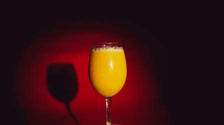 Glass of cool juice stands out on red background in shading. Healthy fresh juice highlighted in shadow.