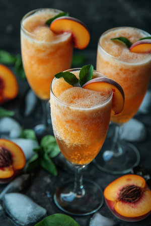 Refreshing Peach Bellini Cocktail With Fresh Peaches, Ice, And Garnish On A Table, Close-Up