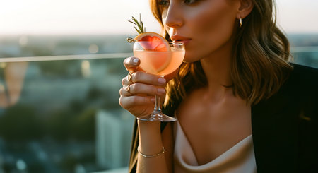A woman enjoying a cocktail on a rooftop with a city view