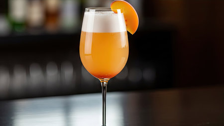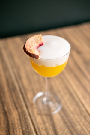 Served cocktail. Bright beverage. Yellow drink with frothy white top in stemmed glass. Refreshing mix with peach garnish on wooden table.