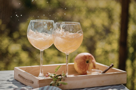 A serene outdoor setting featuring two wine glasses filled with sparkling drinks placed on a wooden tray alongside a fresh apple and a sprig of greenery.