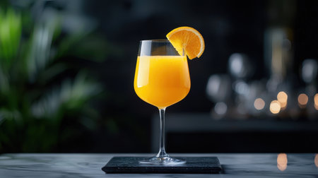 A vibrant orange drink served in a stylish glass, beautifully garnished with a slice of citrus. The soft lighting creates a warm, inviting atmosphere perfect for any occasion.