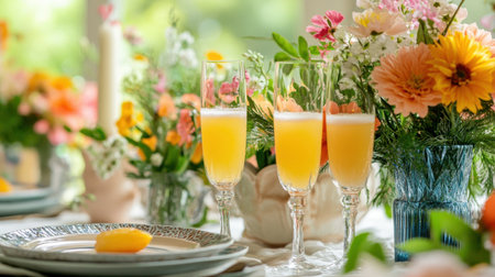 Springtime brunch table with mimosas, fresh flowers, and decorative accents, set in a studio with a bright floral garden vibe