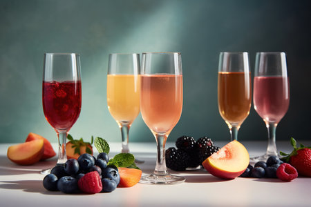 Glasses of rose wine with berries and fruits on white table.