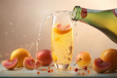 A refreshing sparkling yellow drink served in an elegant glass, set against a lush outdoor backdrop. Perfect for summer gatherings and celebrations.