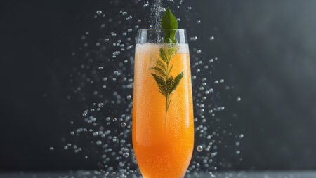 AI Generated. Refreshing orange mimosa with bubbles in tall glass on dark background
