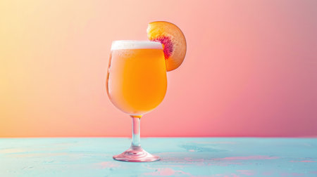 A minimalist shot of nectarine beer in a sleek glass, with a slice of nectarine on the rim, against a pastel-colored background.