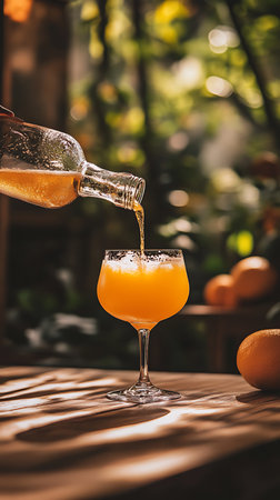 A clear glass bottle pouring orange juice into a stemmed glass, creating a refreshing beverage. The drink sits on a wooden table next to a fresh orange, outdoors.