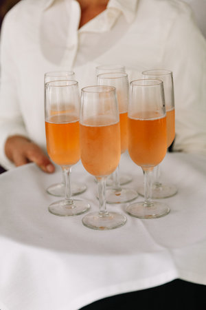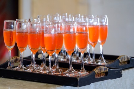 Glasses with tasty fresh orange fruit juice on summer wedding greeting