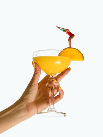 Bright collage. Diver standing on orange cocktail with fruit slice ready to jump