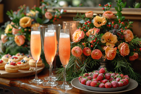 Treat yourself to an indulgent New Year Day brunch High angle view showcasing mimosas a variety of pastries and an elegant floral centerpiece A special way to kick off the year