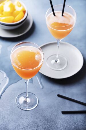 Summer refreshing fruit cocktail bellini of fresh ripe peach and champagne in glasses on modern abstract podium