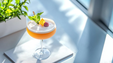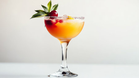 A detailed shot of a stylish cocktail glass with a colorful drink and a garnish, displayed on a clean white surface to emphasize its modern design.