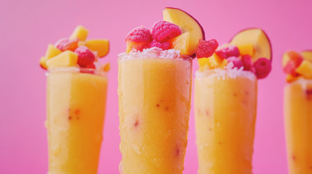 A vibrant tropical smoothie featuring a delicious blend of raspberries and mango, served chilled in a tall glass, perfect for summer gatherings and refreshing snacks.