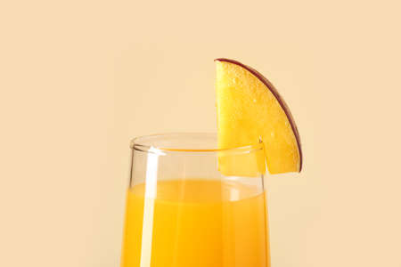 Glass of tasty mango juice on color background