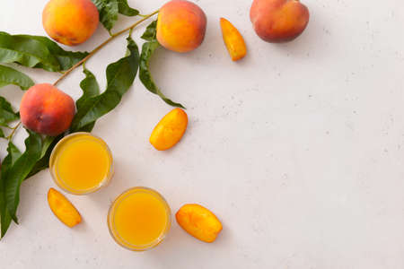 Glasses of tasty peach juice on white background