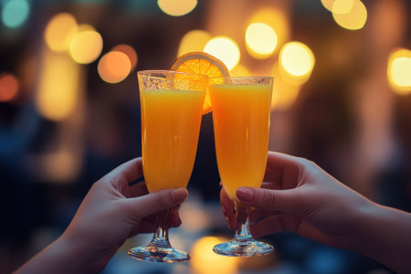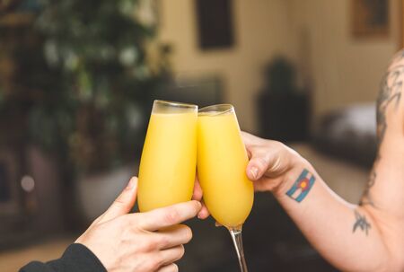 Two people tapping their beverages together for a cheers moment. Two drinks with orange juice and champagne, also known nas a mimosa.