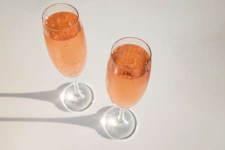 Two glasses with rose sparkling wine on the white table