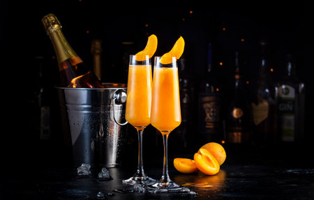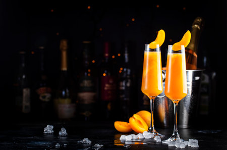 Apricot Bellini alcoholic cocktail drink with prosecco, cava, or sparkling wine with apricot puree, syrup and ice, dark bar counter background, copy space