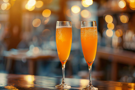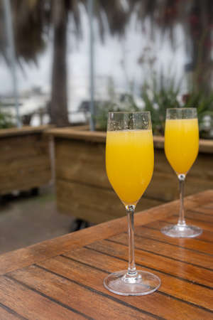 Two glasses of Mimosa outdoor sitting in a restaurant, over a wooden table, selective focus, viewed from the side and without people