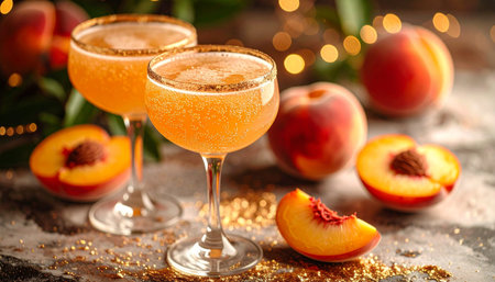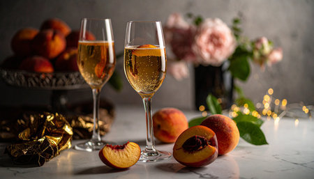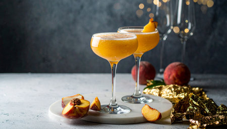 Sparkling peach bellini in champagne flute with peach puree, gold foil, marble, bokeh lights.