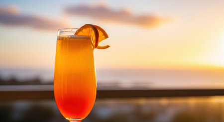 Enjoy a classic brunch drink with this refreshing and fruity Mimosa. Served in a tall champagne flute with a frosted rim, the pale orange-colored drink has a mix of champagne and fresh orange juice. The glass is garnished with a thin slice of orange, adding a pop of color and enhancing the overall flavor. This combination of sweet and bubbly is perfect for any celebratory occasion or weekend brunch.