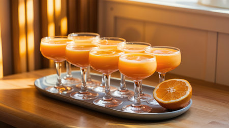A collection of vibrant orange drinks fills tall glasses, creating a lively display. Sunlight streams in, casting shadows and highlighting the drinks sparkling surface, evoking a festive atmosphere.