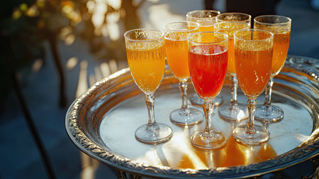 A beautiful assortment of sparkling beverages sits on a silver tray, reflecting the warm golden light of an elegant event, inviting guests to indulge.