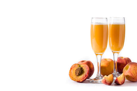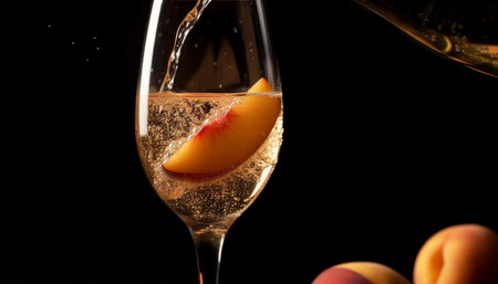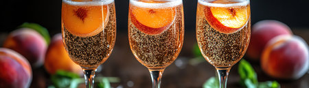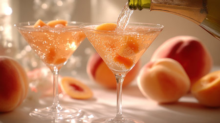 Sparkling cocktail with peach slices is poured into elegant glasses.