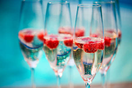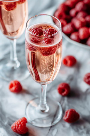 Sparkling rose French kiss cocktail in flutes with raspberries on a marble table