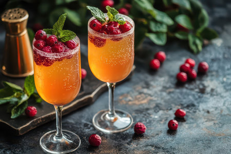 Two elegant glasses of sparkling cocktails are garnished with cranberries and fresh mint leaves creating a festive atmosphere.