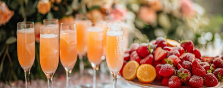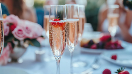 A beautifully arranged table featuring sparkling drinks with strawberries, perfect for a celebration. Ideal for parties, brunches, or gatherings.