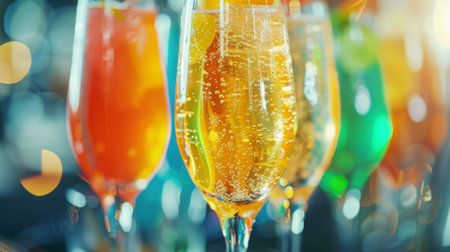 Sparkling glasses filled with vibrant mocktails are lined up on a bar ready to be served