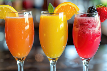 Three Glasses of Colorful Refreshing Cocktails with Fruit Garnish