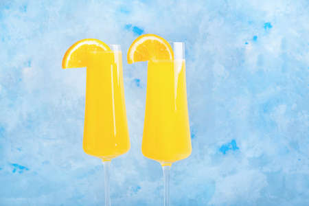 Mimosa alcohol cocktail with orange juice and dry champagne or sparkling wine in glasses, blue background, copy space