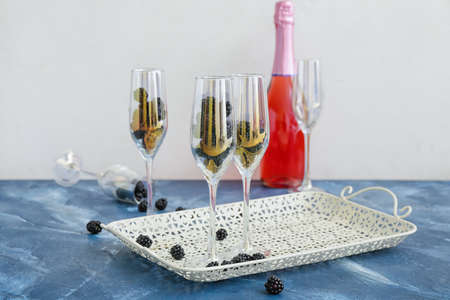 Bellini champagne cocktail in crystal glass on blue wooden table