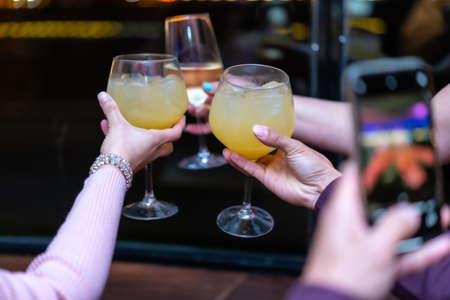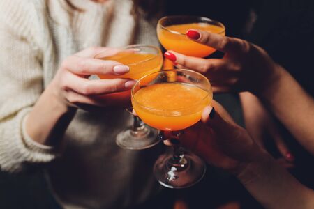 Drinks in a nightclub, friends enjoying a party with their glasses up, shout with orange and gin tonic
