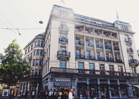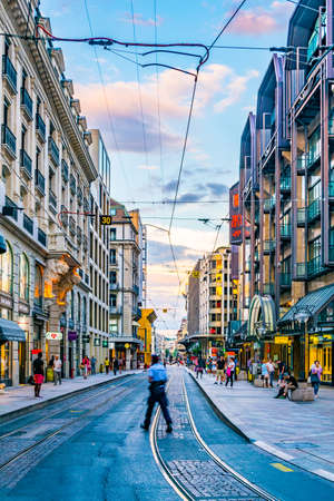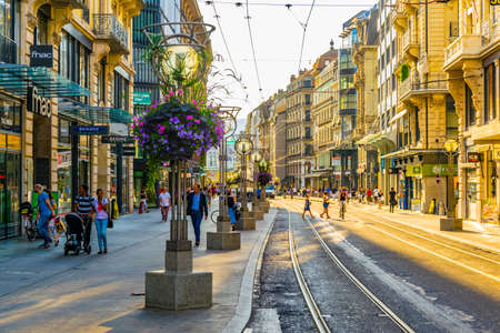 GENEVA, SWITZERLAND, JULY 20, 2017: View of a central street in the swiss city Geneva, Switzerland