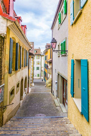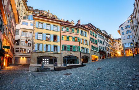 Colorful historical houses in Lausanne city's Old town center, Switzerland