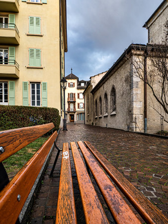 Montreux, Switzerland - April 12, 2022: A landscape of old town of Vevey city, Switzerland.