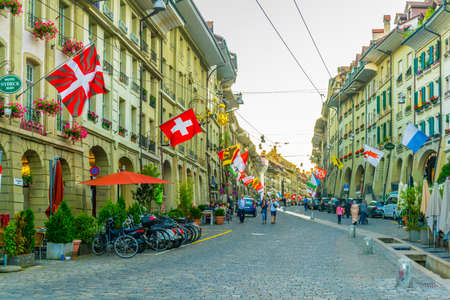 BERN, SWITZERLAND - MAY 26, 2017: A beautiful shopping street at the medieval city of Bern, the capital city of Switzerland.