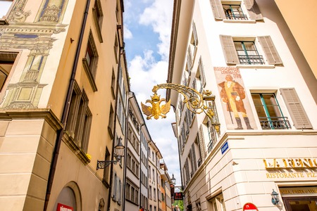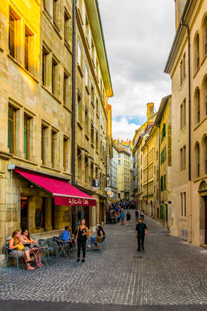 GENEVA, SWITZERLAND, JULY 20, 2017: View of a narrow street in the swiss city Geneva, Switzerland