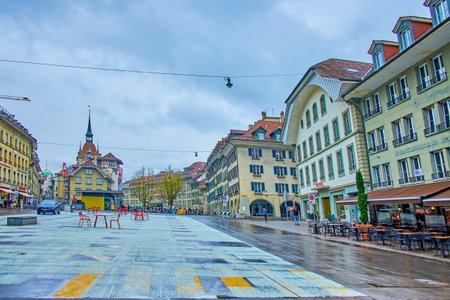 BERN, SWITZERLAND - MARCH 31, 2022: Waisenhausplatz square with historic buildings, Altstadt district, on March 31 in Bern, Switzerland